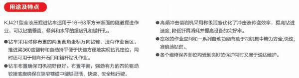 KJ421全液進鉆車用于16-68平方米斷面的進作業,可以苗直、飯斜和水平的爆破孔和錨桿孔。